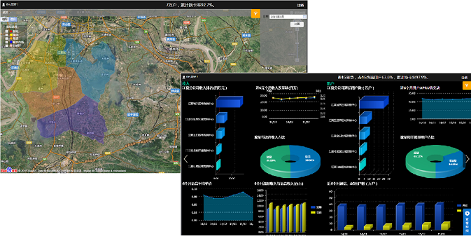 實(shí)時(shí)集中監(jiān)控平臺(tái)以簡(jiǎn)潔、美觀的圖表頁(yè)面,集中展現(xiàn)企業(yè)各環(huán)節(jié)經(jīng)營(yíng)數(shù)據(jù)。武漢移動(dòng)經(jīng)過(guò)多年信息化的建設(shè),已形成區(qū)域化的業(yè)務(wù)管理體系,并積累了大量的業(yè)務(wù)數(shù)據(jù)。為清晰呈現(xiàn)各項(xiàng)指標(biāo)在全市范圍內(nèi)不同區(qū)域的整體情況,億信BI通過(guò)在GIS地圖上對(duì)各區(qū)域模塊進(jìn)行顏色渲染,清晰展示企業(yè)業(yè)務(wù)區(qū)域的分布情況(如下圖左側(cè)所示),同時(shí)通過(guò)多TAB頁(yè)的展示方式(如下圖右側(cè)所示),以專題化(包括收入,用戶發(fā)展、4G發(fā)展等專題)的頁(yè)面,分析了各主題中不同項(xiàng)經(jīng)營(yíng)指標(biāo)的排名,占比,趨勢(shì)以及對(duì)比情況,從而使決策者可快速定位自己所關(guān)心的重點(diǎn)數(shù)據(jù)。