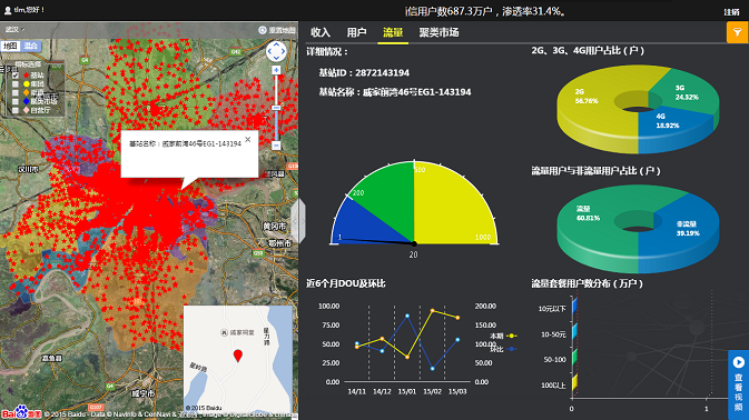 武漢移動(dòng)基于已有的大量基站,集團(tuán)客戶,營(yíng)業(yè)廳等各項(xiàng)指標(biāo)的地理信息,結(jié)合億信BI的GIS應(yīng)用,實(shí)現(xiàn)了地圖上40000多個(gè)基站數(shù)據(jù)點(diǎn)的標(biāo)注。平臺(tái)利用億信BI,將基站、營(yíng)業(yè)廳已有的GPS坐標(biāo)換算成百度坐標(biāo),使其可以在百度GIS上進(jìn)行精準(zhǔn)的標(biāo)注。再在平臺(tái)頁(yè)面中,通過(guò)百度GIS地圖上的數(shù)據(jù)點(diǎn)的標(biāo)注,以直觀的密集度呈現(xiàn)出武漢市區(qū)域范圍內(nèi)基站以及營(yíng)業(yè)廳等指標(biāo)的分布情況,輔助領(lǐng)導(dǎo)進(jìn)行決策。