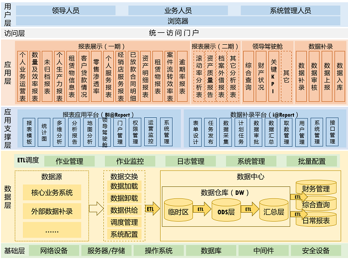 基于對(duì)業(yè)務(wù)數(shù)據(jù)的匯總、加工等數(shù)據(jù)模型設(shè)計(jì),在成熟的數(shù)據(jù)采集產(chǎn)品和數(shù)據(jù)補(bǔ)錄軟件平臺(tái)的基礎(chǔ)上構(gòu)建了數(shù)據(jù)展現(xiàn)分析模塊、數(shù)據(jù)補(bǔ)錄報(bào)送模塊 、用戶權(quán)限管理模塊以及門戶配置模塊 。