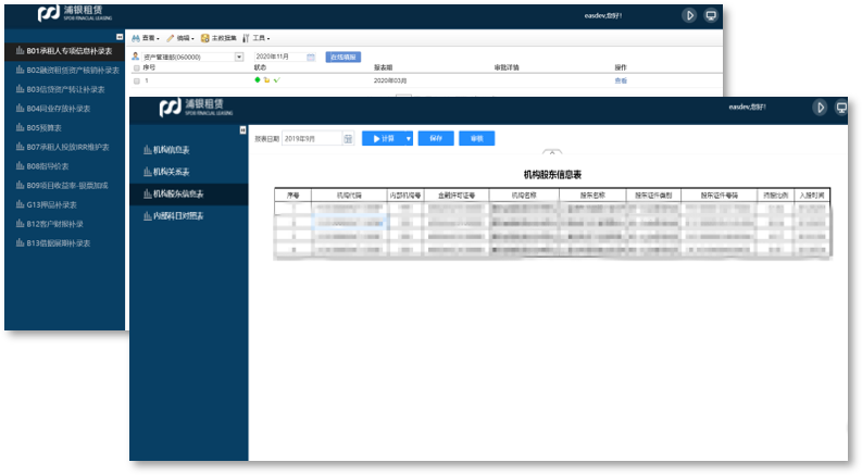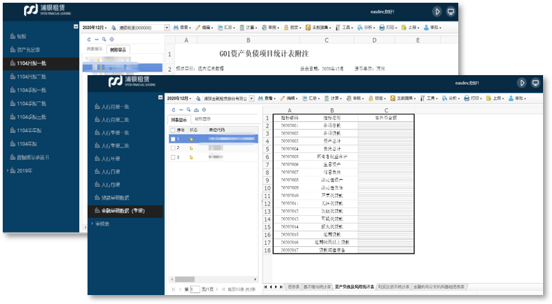 浦銀租賃大數(shù)據(jù)服務(wù)平臺(tái)一共建設(shè)了183張報(bào)表,涵蓋日常工作報(bào)表、財(cái)務(wù)報(bào)表、監(jiān)管報(bào)送、1104報(bào)表、人行報(bào)表、總行報(bào)表、EAST報(bào)表等,滿(mǎn)足公司領(lǐng)導(dǎo)、資產(chǎn)部門(mén)、財(cái)務(wù)部等各部門(mén)人員多樣化的數(shù)據(jù)分析需求。幫助高管快速掌握公司的運(yùn)營(yíng)情況,精細(xì)化管理;讓業(yè)務(wù)人員自助拖拽報(bào)表,釋放實(shí)施人員精力,為業(yè)務(wù)人員提供工作便利,提高工作效率;支持監(jiān)管報(bào)表的填報(bào)、審核、上報(bào)、匯總等工作,滿(mǎn)足監(jiān)管報(bào)表的定時(shí)報(bào)送要求。