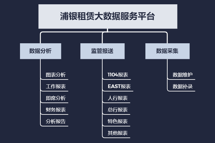 基于監(jiān)管報(bào)表生成質(zhì)量無(wú)法得到有效保證、內(nèi)外部數(shù)據(jù)的統(tǒng)計(jì)分析工作成為日常辦公基本需要、各部門(mén)對(duì)數(shù)據(jù)服務(wù)提出較高要求等問(wèn)題,浦銀租賃大數(shù)據(jù)服務(wù)平臺(tái)總體設(shè)計(jì)分為數(shù)據(jù)分析、監(jiān)管報(bào)送和數(shù)據(jù)采集三大模塊。