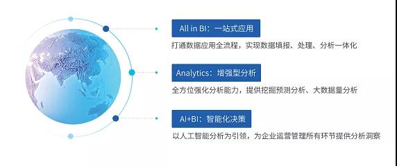 AII in BI:一站式應用型BI。產品功能全面,打通數據應用全流程,實現數據填報、處理、分析一體化。一個產品平臺即可為政企用戶提供從數據準備,ETL數據處理、數據建模、數據可視化、數據分析、數據填報、移動應用等一系列功能。