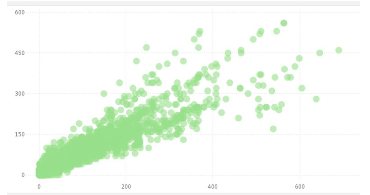 散點(diǎn)圖可以顯示數(shù)據(jù)集群的形狀,分析數(shù)據(jù)的分布。通過(guò)觀察散點(diǎn)的分布,可以推斷變量的相關(guān)性。